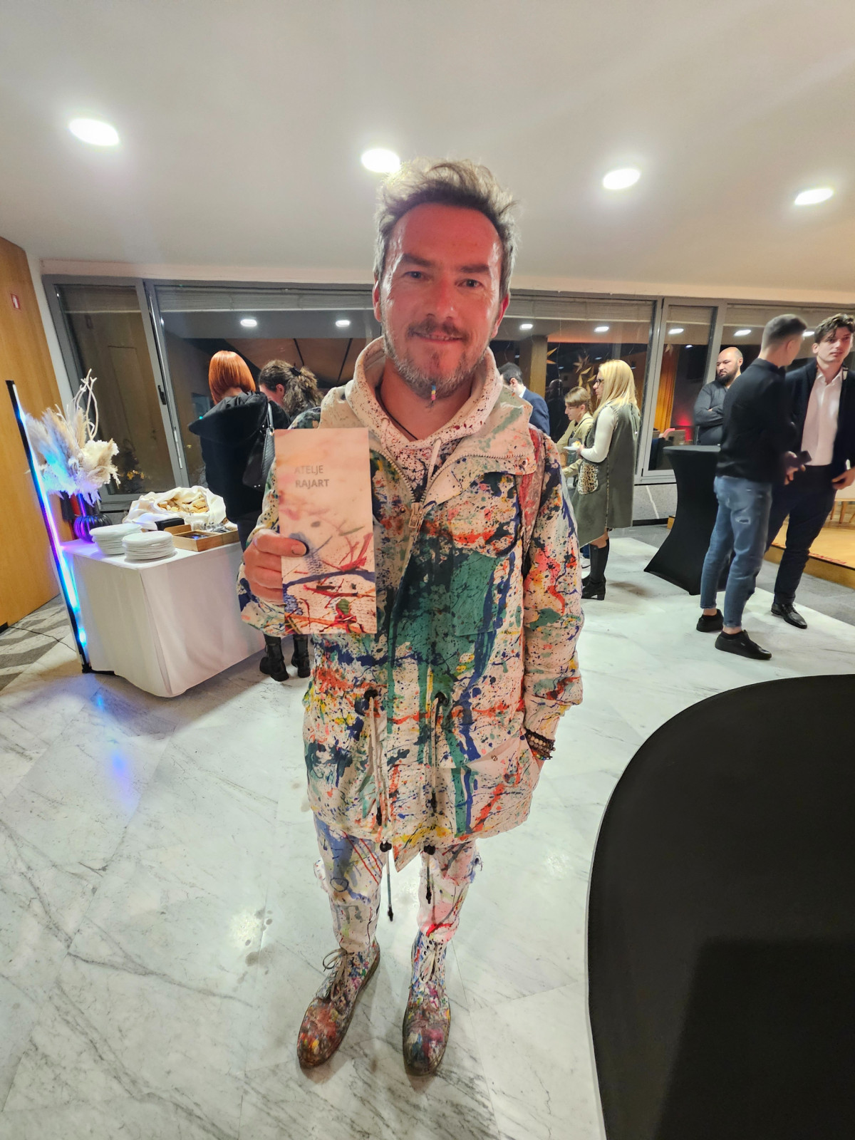 Toda bistvo Rajkove zgodbe se ne skriva samo v njegovih delih, ampak v energiji in vizualni predstavi, ki jo izžareva sam. Ko sem ga srečal na prireditvi SBC kavarna, sem ga najprej opazil zaradi njegovega outfita – vse, od čevljev, hlač, jakne, do telefona, je bilo umetniško obarvano. Bil je prava živa slika, ki se je popolnoma zlila z njegovim umetniškim izrazom. Bil je hodeča abstraktna slika in najboljša predstava njegovega bistva.