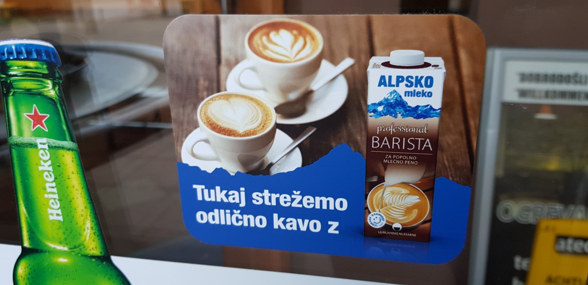 Po vzoru nalepk porini vleči, ki so jih oglaševalci uporabljali, najbolj znan oglaševalec je prav Coca Cola, ki pogosto ponudili gostincem, sem zdaj na enem izmed lokalov ugledal tudi nalepko Alpskega mleka Barista s pripisom "Tukaj strežemo odlično kavo z .... Alpsko mleko Barista".