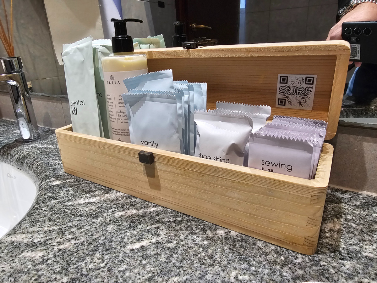 V košarici najdete paket z zobno ščetko in pasto za umivanje zob, vatirane paličice in vato, komplet za čiščenje čevljev in celo set za šivanje. Tako se lahko brez skrbi uredite in se s svežim videzom vrnete k mizi, pripravljeni na nadaljnje užitke ob hrani in družnbi.