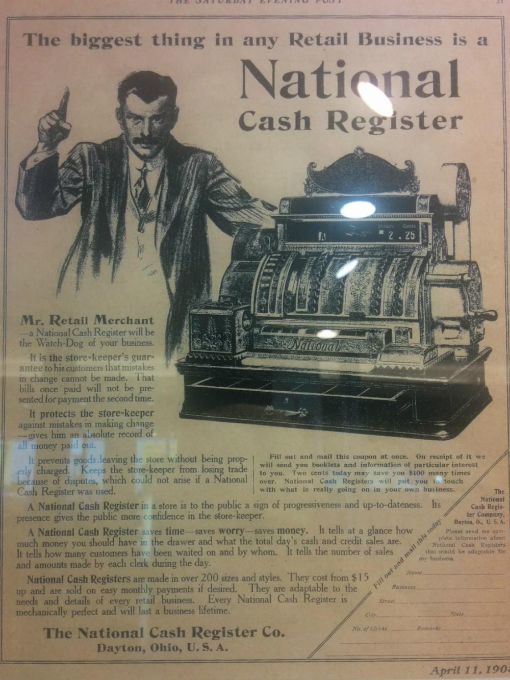 V dnevnih poročilih smo že zasledili, da država uvaja davčne blagajne, ampak to je tudi vse. Nobenega prodajnega nagovora, nobene strasti, nobenega občutka prestiža. V začetku 20 stoletja so v ZDA pričeli uvajat blagajne, katerih cena se je pričela z 15 USD, preračunano bi to danes znašalo 403 USD. In da bi se čim več trgovcev odločilo za nakup blagajne je podjetje National izdelalalo sledeč letak.