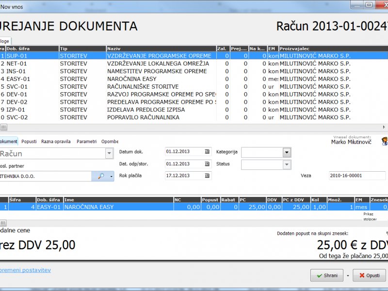 Program je namreč brezplačen, kar pa je potrebno porabnati, pa je 25 € mesečnega stroška za potrebe vzdrževanja. In verjemite, ko spoznate, kaj vse vam program za izdajanje računov Easy omogoča, si želite to izkoristiti. In ponudnik sistema gospod Marko Milutinovič, vam bo z veseljem odpravil vse težave in vam pomagal pri vseh izpisih ter poskrbel, da bo sistem v skladu z slovensko zakonodajo.